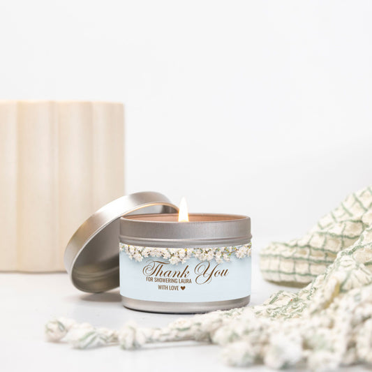 Personalized Dusty Blue Floral Bridal Shower Candle Favor - Tin 4oz