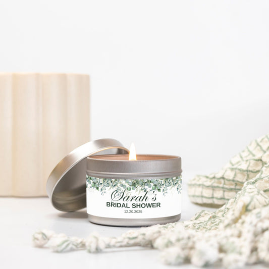 Personalized Eucalyptus Greenery Themed Bridal Shower Candle Favor - Tin 4oz