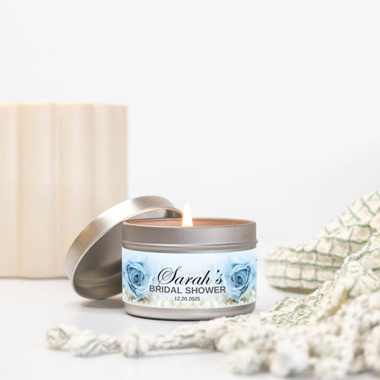 Personalized Dusty Blue Rose and Pearl Bridal Shower Candle Favor - Tin 4oz