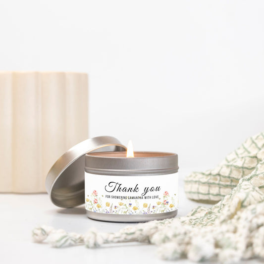 Personalized Wildflower Themed Bridal Shower Candle Favor - Tin 4oz